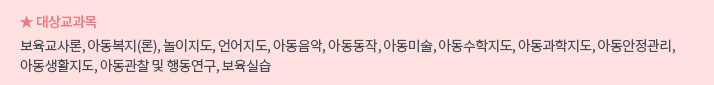 º¸À°Áö½Ä°ú±â¼ú | Çʼö | º¸À°Çа³·Ð, º¸À°°úÁ¤, ¿µÀ¯¾Æ¹ß´Þ, ¿µÀ¯¾Æ ±³¼ö¹æ¹ý·Ð, ³îÀÌÁöµµ, ¾ð¾îÁöµµ, ¾Æµ¿À½¾Ç(¶Ç´Â ¾Æµ¿µ¿ÀÛ, ¾Æµ¿¹Ì¼ú), ¾Æµ¿¼öÇÐÁöµµ(¶Ç´Â ¾Æµ¿°úÇÐÁöµµ), ¾Æµ¿¾ÈÀü°ü¸®(¶Ç´Â ¾Æµ¿»ýȰÁöµµ) |