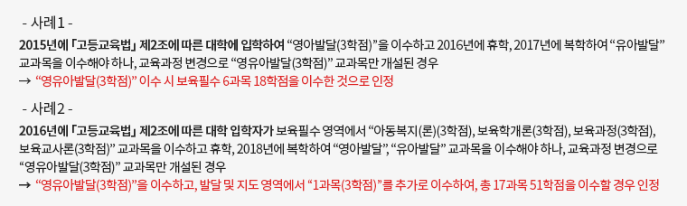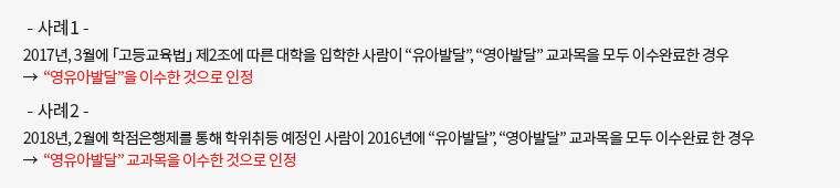 ¡Ø´Ü, "¿µ¾Æ¹ß´Þ", "À¯¾Æ¹ß´Þ" ±³°ú¸ñ À̼ö·Î 'º¸À°Áö½Ä°ú ±â¼ú' ¿µ¿ª¿¡¼ ÃʰúµÇ´Â ÇÐÁ¡ÀÌ ¹ß»ýÇÑ °æ¿ì¿¡µµ '±³»çÀμº', 'º¸À°Áö½Ä°ú±â¼ú', 'º¸À°½Ç¹«'°¢ ¿µ¿ªº° À̼ö±âÁØÀº ÃæÁ·ÇØ¾ß ÇÔ |